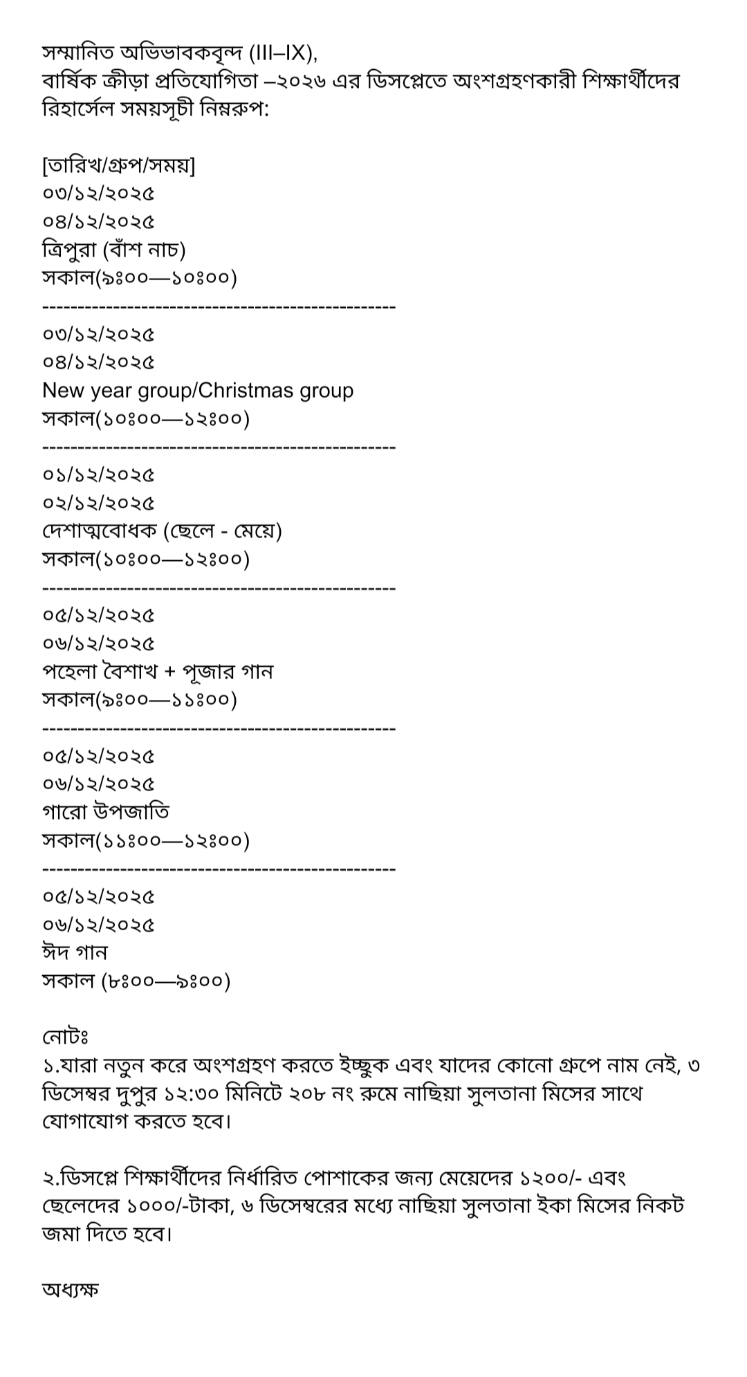 বার্ষিক ক্রীড়া প্রতিযোগিতা –২০২৬ এর ডিসপ্লেতে অংশগ্রহণকারী শিক্ষার্থীদের রিহার্সেল সময়সূচী