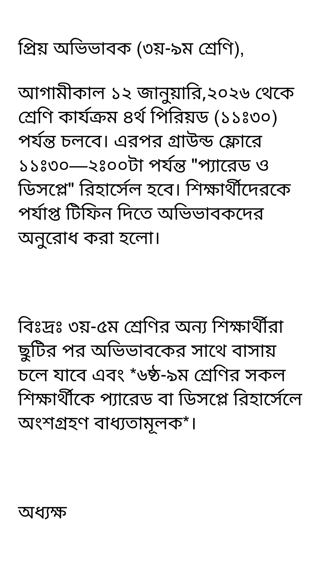 ১২ জানুয়ারি, ২০২৬ থেকে ৪র্থ পিরিয়ডের পর প্যারেড ও ডিসপ্লে