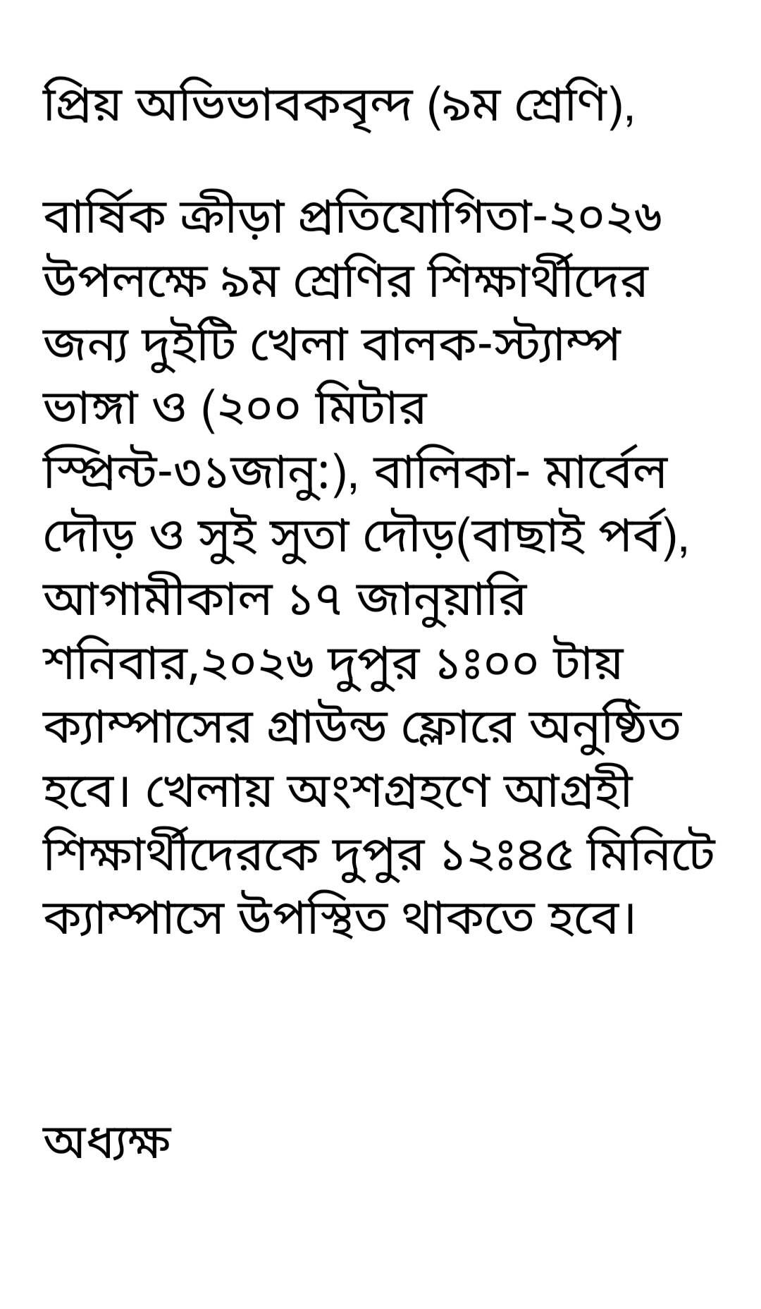 ৯ম শ্রেণির বার্ষিক ক্রীড়া প্রতিযোগিতা-২০২৬