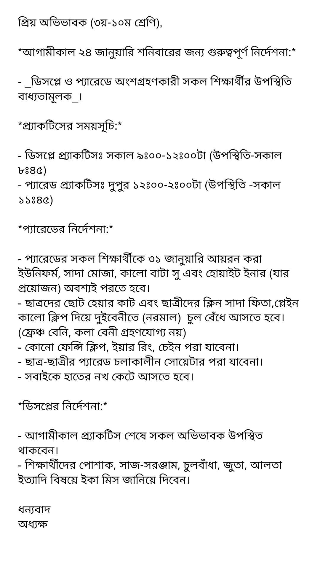 ৩য়-১০ম শ্রেণি ২৪ জানুয়ারি শনিবার , ২০২৬ প্যারেড ও ডিসপ্লে প্র্যাকটিস।