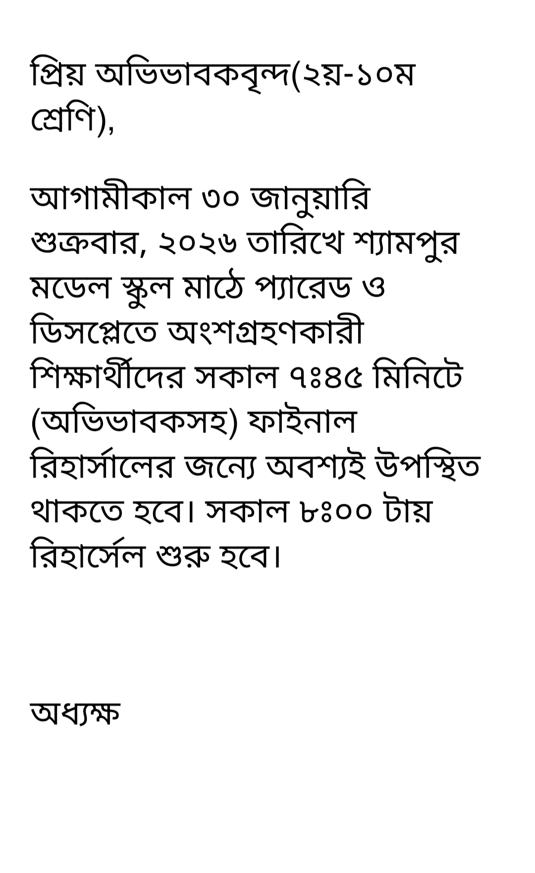 আগামীকাল ৩০ জানুয়ারি, প্যারেড স্পেস সময়সূচি