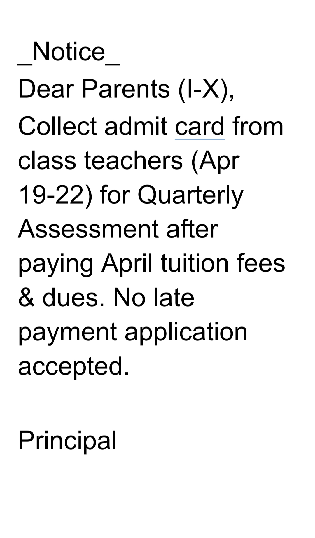 Admit Card Collection Notice. (I - X)